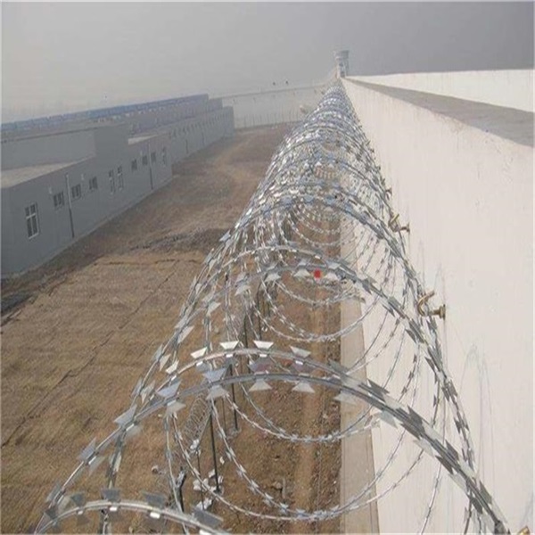 監(jiān)獄看守所蛇腹式刀刺網(wǎng)材料有中碳鋼絲、冷軋鍍鋅薄板,不銹鋼板,不銹鋼絲。蛇腹型刀片刺網(wǎng),上、下懸掛0.5米的交叉蛇腹型刀片刺網(wǎng),刀片刺網(wǎng)采用鋼板沖壓成型包附于鋼絲(筋絲)之上,由銳利尖角鋅鋼板或不銹鋼薄板做刀片,高張力鋼絲做芯線組合而成的。鋒利的刀型刺由雙線扣裝后成蛇腹狀既美觀又讓人不寒而粟。起到了很好的阻嚇作用。刀片刺網(wǎng)硬度好,制造及特點:鋼絲為芯絲,將沖壓好的刀片包裹在芯絲上,一次制成。產(chǎn)品具有很強的防護能力和恐嚇能力,安裝方便,壽命長。
