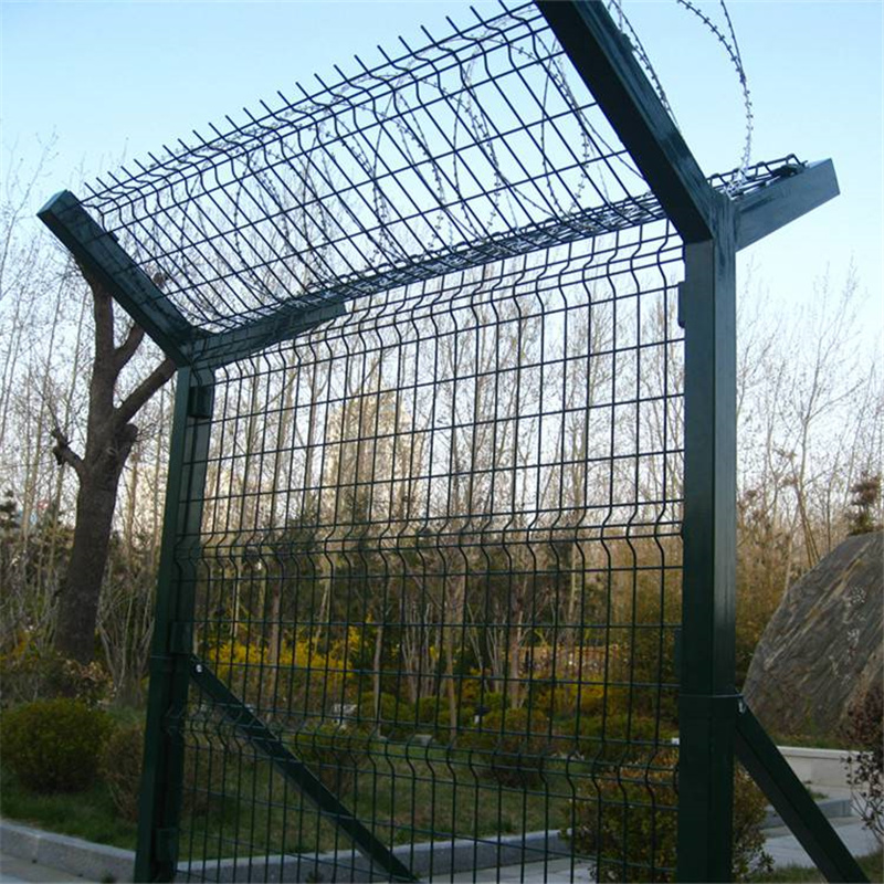 監獄防護網 (監獄鐵絲網)具有鞏固耐用、美觀大方、鋒鋒利、防攀爬、抗強風、抗沖擊、抗剪切、抗腐蝕等優異特色。 用處:監獄鋼網墻首要用于監獄、看守所、戒毒所、軍事禁區、邊防線等高安全場所。