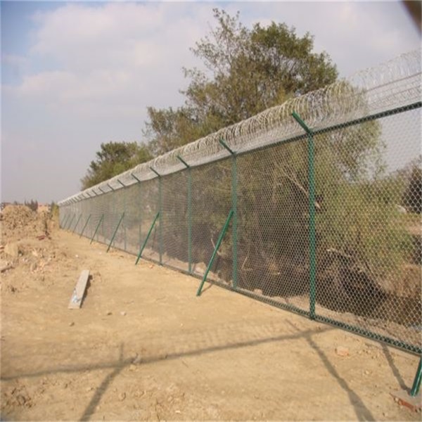 機場焊接防護隔離圍界:絲徑:4mm-6mm, 網孔:50*100mm 高度:1.8-3m  寬度:2-3m 頂部加防爬刺滾網,另外一種焊接的防護隔離圍界是用刀片刺網直條焊接而成的,網孔一般為:75*150mm ,高度和寬度(同上),這種用刀片直條焊接的機場防護圍界,具有更好的防攀爬防隔離效果。