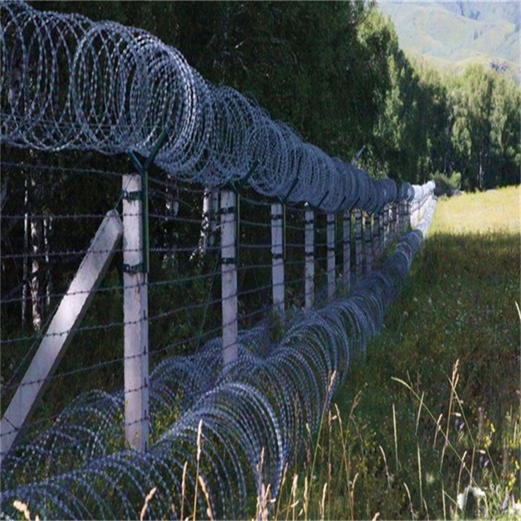 4、211型邊境鐵絲網,鐵絲網的結構是下面兩道上面依次跺起來1道,從下到上總共是3道鐵絲網。接下來我們詳細說明一下211邊境鐵絲網,此結構的鐵絲網下面兩道采用直徑是90公分的刀片刺網之后上面在放一道直徑90公分的刀片刺網,上面安裝一道直徑是60公分的刀片刺網。架設的立柱類似干字型支架,架設立柱高2.4米,立柱采用Q235材質50*50*2mm方管,柱高2.4m;橫向支架用40*40*3.5mm角鐵,橫向支撐3道,表面處理浸塑防腐處理、墨綠色。