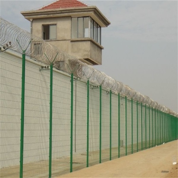 監獄獄墻外圍隔離網材質采用優質低碳鋼絲性價比高,網絲直徑4mm。網孔均勻分布,網孔為50*50mm。立柱采用60*60方形國際鋼管,管壁厚度3mm,高度為3400mm,立柱頂端應進行防水密封處理。Y型柱的V型托長度600*600mm,采用20*30*1.2的方管。立柱間距2500mm,網片寬度根據實際可用空間合理調整。刀刺網刀片為不銹鋼板沖壓出的尖銳菱形刀片,芯線直徑2.5mm、刀片長21mm,刀寬15mm,厚度0.5mm。刀刺網直徑600mm。刀刺網排列額度10圈/M。每個卡扣之間的間距為200mm。立柱混凝土基座并預埋鋼結構與立柱連接,基座采用地埋方式安裝,地埋濃度大于凍土層厚度,為500mm。柱與網框之間用防盜螺絲貫穿式連接。