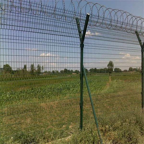 防爬Y型機場圍界網頂部裝有刀片刺絲和刀片刺繩,安全保護功能將得到很好的加強。其產品外形美觀,顏色多樣,不僅起到圍欄的作用,還起到美化的作用。Y型機場圍界網可以電鍍、熱鍍、噴涂、浸塑等防腐形式,具有良好的抗老化、防曬、耐候等特點。艾瑞根據用戶需求生產各種規格和尺寸的Y型機場圍界網產品!