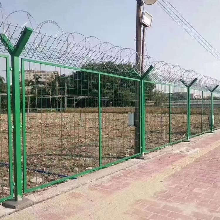 一方式比較復雜些,挖坑做30X30X30見方的混凝土基礎,然后把立柱埋入混凝土基礎中,待混凝土凝固后,再安裝網片以及蛇腹型刀刺網,這樣的安裝方式主要是以工人挖坑消耗工時,預埋立柱時一定要拉好標準線,確保預埋的立柱為統一直線上。