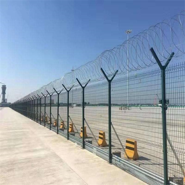 機(jī)場(chǎng)焊接防護(hù)隔離圍界:絲徑:4mm-6mm, 網(wǎng)孔:50*100mm 高度:1.8-3m 寬度:2-3m 頂部加防爬刺滾網(wǎng),另外一種焊接的防護(hù)隔離圍界是用刀片刺網(wǎng)直條焊接而成的,網(wǎng)孔一般為:75*150mm ,高度和寬度(同上),這種用刀片直條焊接的機(jī)場(chǎng)防護(hù)圍界,具有更好的防攀爬防隔離效果。