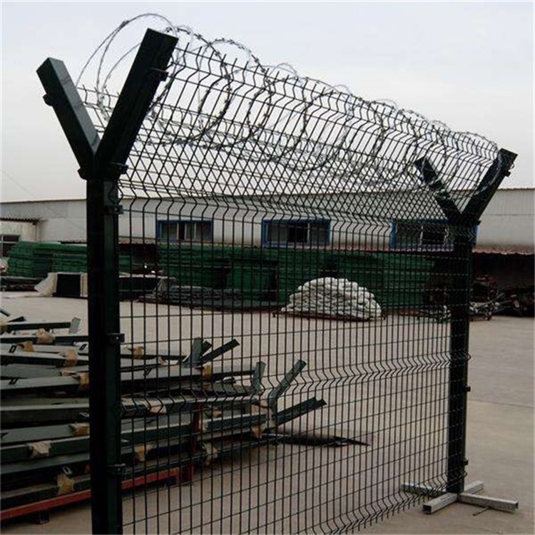 1、機場護欄網也被稱為機場護欄或Y型安全保護網,由V形支架立柱,加強焊接網片,安全防盜聯接件和熱浸鍍鋅刀片組成。
