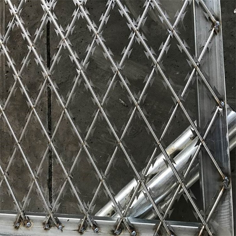 監(jiān)獄刀刺鋼網(wǎng)墻(刀刺焊接隔離網(wǎng))是一種全新的監(jiān)獄隔離網(wǎng)形式,監(jiān)獄刀刺鋼網(wǎng)墻又名刀片刺繩隔離網(wǎng)、刀刺隔離網(wǎng)。該產(chǎn)品具有嚇阻效果好.美觀.施工便利.經(jīng)濟實用等優(yōu)異特點。網(wǎng)格中布滿刀刺是該產(chǎn)品的特點,可以更好的起到防御恐嚇作用。