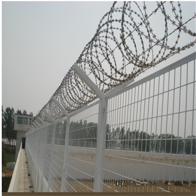 3、防攀爬v型網與蛇腹形刀刺網 防攀爬是監獄鋼網墻必須必備的特點,我們一般會在監獄鋼網墻頂端架設蛇腹形刀刺網。現在監獄架設的蛇腹形刀刺網型號為BTO-22型號,根據規定不同的地方架設的刀刺網圈經不一樣,一般有φ50cm、φ60cm、φ80cm。 固定蛇腹形刀刺網,需要在鋼網墻頂端行成一個V字型,一般有鋼筋焊接V型網和拉線構成V型。架設的時候采用特定的卡扣、按照規定的間距進行安裝就行。