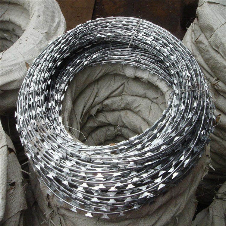 刀片刺繩屬于一種優(yōu)質(zhì)的阻絕措施,由不銹鋼板或者鍍鋅鋼板經(jīng)過(guò)沖壓刀型和芯線制成,芯線一般是由具有很大張力的鋼絲做成的,原材料的特性造就了刀刺網(wǎng)具有防破壞、防腐蝕等特點(diǎn)。刀刺網(wǎng)具有銳利的刀尖,所以從外觀上來(lái)看就給人一種恐怖的感覺(jué)。這種獨(dú)特的結(jié)構(gòu)賦予了刀刺網(wǎng)良好的防護(hù)功能,很多高安全場(chǎng)所、高級(jí)住宅區(qū)就是利用了刀刺網(wǎng)良好的防阻效果,將刀刺網(wǎng)普遍地安裝到了外圍墻上,使場(chǎng)地和住宅區(qū)的安全得到了保障。