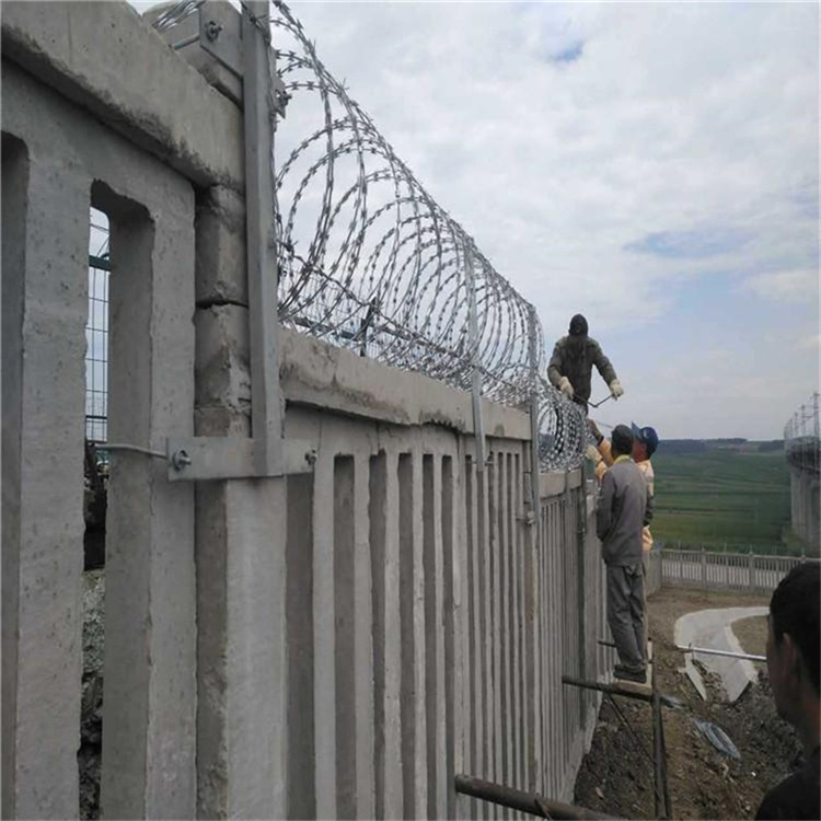 刺絲滾籠由刺絲連接卡扣與固定在支架上的縱向拉筋相連接,縱向拉筋與支架的連接采用中2.5mm的冷拔鍍鋅鋼絲繞2圈后擰緊固定。支架設置在跨度3m防護柵欄的立柱和跨中位置,其它跨度僅設置于立柱上部,支架與防護柵欄采用支架抱箍連接。刺絲滾籠的下緣距離鋼筋混凝土防護柵欄上緣的垂直距離為0.05m。