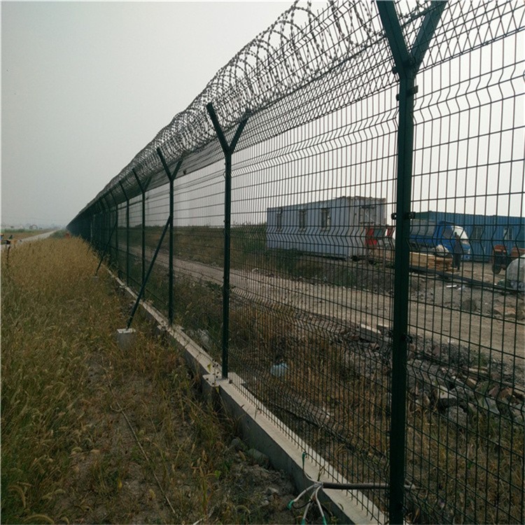 機場焊接網隔離柵上面我們安裝上鋒利的蛇腹狀刀片刺網,刀片刺網有著鋒利的刀片,是采用鍍鋅板或不銹鋼經刀片刺網沖壓機沖壓,再和高張力鋼絲做芯線組合而成。既美觀大方,又使人不寒而栗。以前經常被人們應用于圍墻之上,以防止人們翻越圍墻。現在已經被人們和護欄網完美的結合,稱為“刀片刺網防護網”,大家可以想象一下,高高的互聯網本來就不是那么好翻越的,在加上上面有那鋒利的刀片,想想連手都沒有地方放,更不要提爬上去并翻過刀片刺網了,那可以說是不可能的事情了。