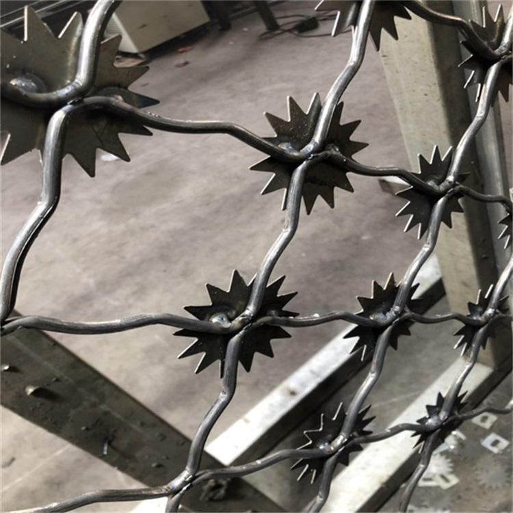 梅花刺網(wǎng)又稱監(jiān)獄護(hù)欄網(wǎng)或監(jiān)獄隔離柵,主要是采用高強(qiáng)度的刀片刺網(wǎng)與普通防護(hù)網(wǎng)的結(jié)合,由V型支架立拄,加強(qiáng)型焊接片網(wǎng),安全防盜連接件和刀片刺網(wǎng)組成.刀片刺網(wǎng)是一種新型防護(hù)網(wǎng),由銳利尖角鍍鋅鋼板或不銹鋼薄板做刀片,鋼絲做芯線組合而成的防護(hù)器材