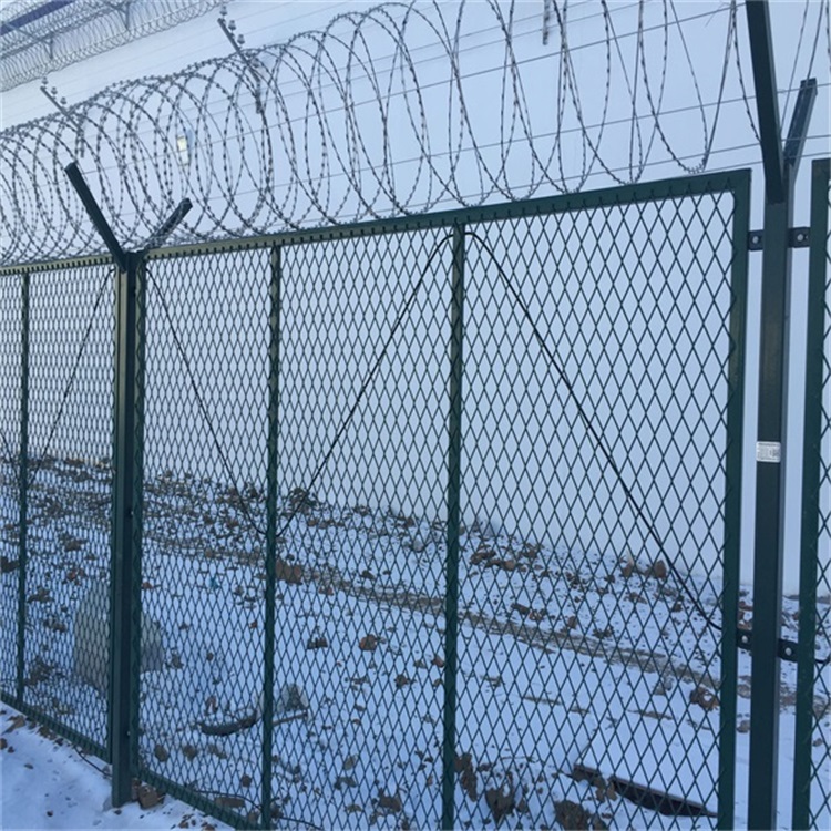 監(jiān)獄功能區(qū)隔離網(wǎng)高度不得低于3米,邊框厚度不得少于1.2mm,網(wǎng)孔不得大于50X100mm,鐵絲絲徑不得少于5mm,選用材質(zhì)必須為鍍鋅材質(zhì),然后在進(jìn)行塑料包裹處理,也就是常說的靜電噴涂和浸塑處理。監(jiān)獄隔離網(wǎng)頂部必須安裝防止跨越的蛇腹型刀刺網(wǎng),立柱規(guī)格不得小于6mm的方管,無論是網(wǎng)片焊接處還是立柱焊接處,必須360度滿焊,不得出現(xiàn)漏焊和焊縫開裂現(xiàn)象,表面處理塑層包裹均勻,不得出現(xiàn)漏塑或者局部燒焦烏黑狀出現(xiàn)。