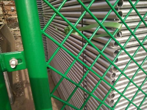 海關保稅區隔離網一般采用菱形孔金屬隔離網,材質:鍍鋅材料;邊框:直徑40圓管,壁厚3mm;工藝:焊接然后浸塑;絲徑:5mm;孔徑:50*50mm斜方形孔;立柱:直徑76圓管,壁厚3.5mm,柱高2.9米(立柱頂端30公分彎頭);網片尺寸:1.5米(柱中1.7米)*2.2米高,表面處理:浸塑,一般為墨綠色、草綠色、白色、灰色等。