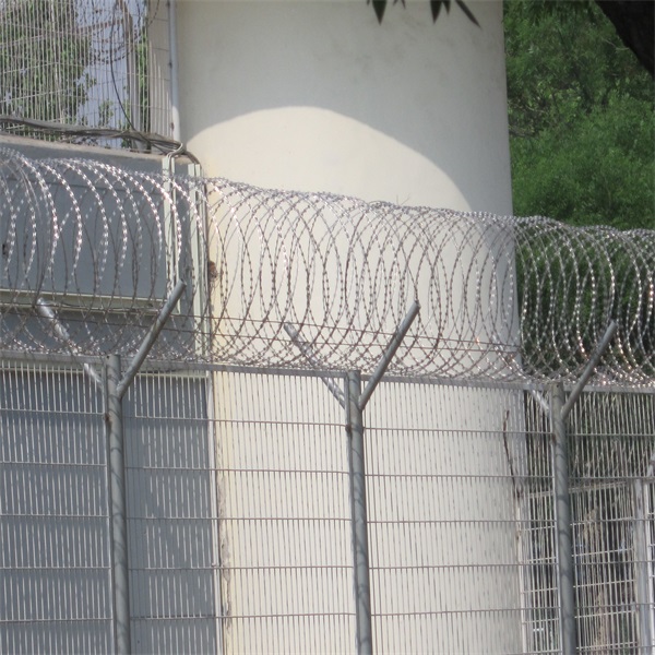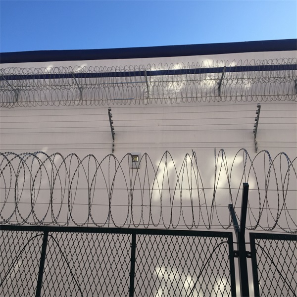 蛇腹型刀刺網在監獄鋼網墻頂部的安裝注意事項∶1.將拉線展開拉直固定在立柱頂部的V形支架上,由于需要安裝的刀片刺絲有許多鋒利的尖刺,注意采取防護措施,以免傷到施工人員。2.刀片刺絲(直徑600mm )打開包裝,首先將一端固定在支架上后,按照螺旋順序展開,均勻分布間距控制在10圈/m,刀片刺絲與刺繩的交點處用綁線捆扎固定。3.檢查各連接部位是否連接牢固4.驗收