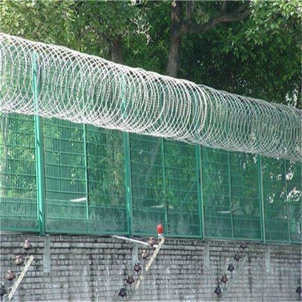 看守所金屬鋼網墻搭配不銹鋼刀刺網不僅可以平地而起,還可以在圍墻二次安裝。有效防止防攀爬。近兩年金屬鋼網墻搭配不銹鋼刀刺網已經成為監獄、看守所、武警中隊、拘留所、戒毒所的安全圍墻。