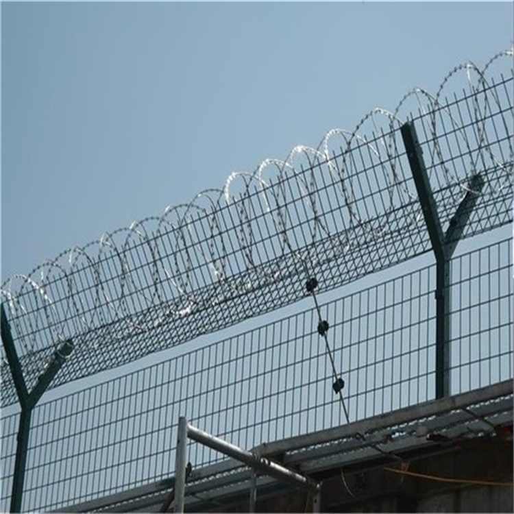 監獄鋼網墻網高一般采用 2 米,立柱高度 2.5 米成 Y 字型,在 2 米高的網片上邊架上直徑 50cm 或 60cm 的刀刺網,... 監獄網墻制造及特點:鋼絲為芯絲,將沖壓好的刀片包裹在芯絲上,一次制成。產品具有極強的防護能力和的恐嚇能力,安裝方便,壽命長。 [ 查看詳情 ]