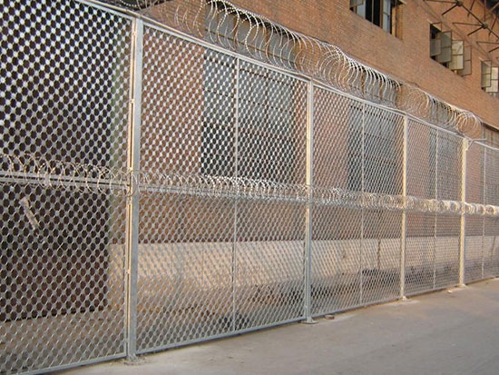 看守所鋼網墻通常采用鋼絲直徑為5mm、6mm、6.5mm,網孔采用50mm*100mm、50mm*50mm、50mm*200mm、50mm*150mm,