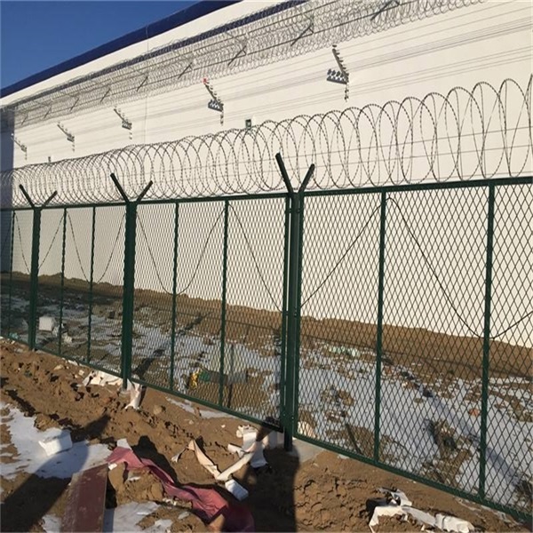 防攀爬金屬鋼網(wǎng)墻網(wǎng)加蛇腹形螺旋雙交叉式刀刺網(wǎng)。
