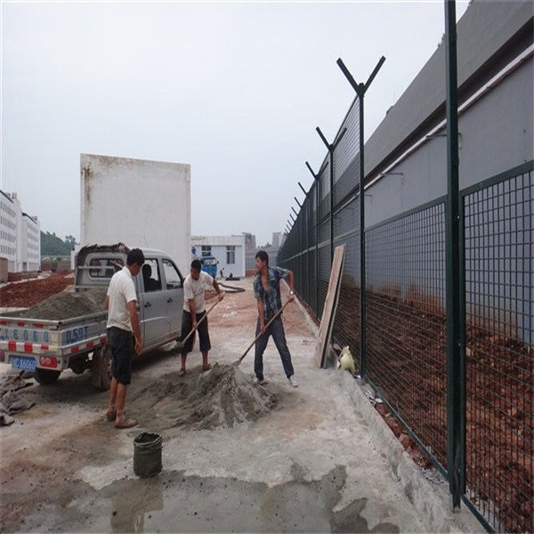 監獄警戒金屬網墻以2.4m長為一個制作、安裝單元,即金屬隔離網墻單元規格為2400mm (長)×3200mm(高)。金屬隔離網墻每2.4米設置一安裝基座,基座采用混凝土制作,其上安裝立柱一根,立柱底端焊接法蘭盤,法蘭盤與混凝土基座內的預埋螺栓(4個M16×300mm)固定連接。網墻單元設計為具有邊框的隔離網片,邊框與立柱之間用熱鍍鋅螺栓和專用防拆螺栓固定。立柱上方焊接V型支架,其上安裝0800mm的蛇腹形不銹鋼刀刺網,其中內側金屬隔離網墻在靠近監獄一側]頂揣加掛一道0800mm蛇腹形不銹鋼刀刺網,從加掛蛇腹形刀刺網底部的網片向下1.5米處,每個橫向絲筋加裝直線形不銹鋼刀刺,以增加攀爬難度,延緩翻越時間,在內側金屬隔離網墻上安裝光纖報警系統,以達到提前報警預警的作用。網墻下方設防挖擋板,其深度不低于500mm。設計要求: